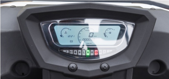 Prístrojová doska s modro podsvieteným displejom je dobre čitateľná, a poskytuje všetky dôležité informácie. K dispozícii máte digitálny otáčkomer, digitálny rýchlomer, ukazovateľ počtu najazdených km, ukazovateľ počtu motohodín, indikátor zaradeného pohonu 2WD / 4WD, ukazovateľ teploty chladiacej kvapaliny, digitálne palivomer, kontrolka neutrálu, diaľkových svetiel, ukazovateľov smeru, zaradenej spiatočky a kontrolka motora.