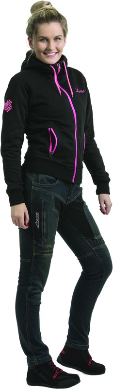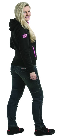 DARA - aramid hoodie dámska- mikina s kapucňou kompletne podšitá kevlarom- ružové doplnky- príprava pre chrániče chrbta, lakťov a ramien- možno dokúpiť chráničový set MBW- krátky zips na zopnutie s nohavicami [čítať viac]