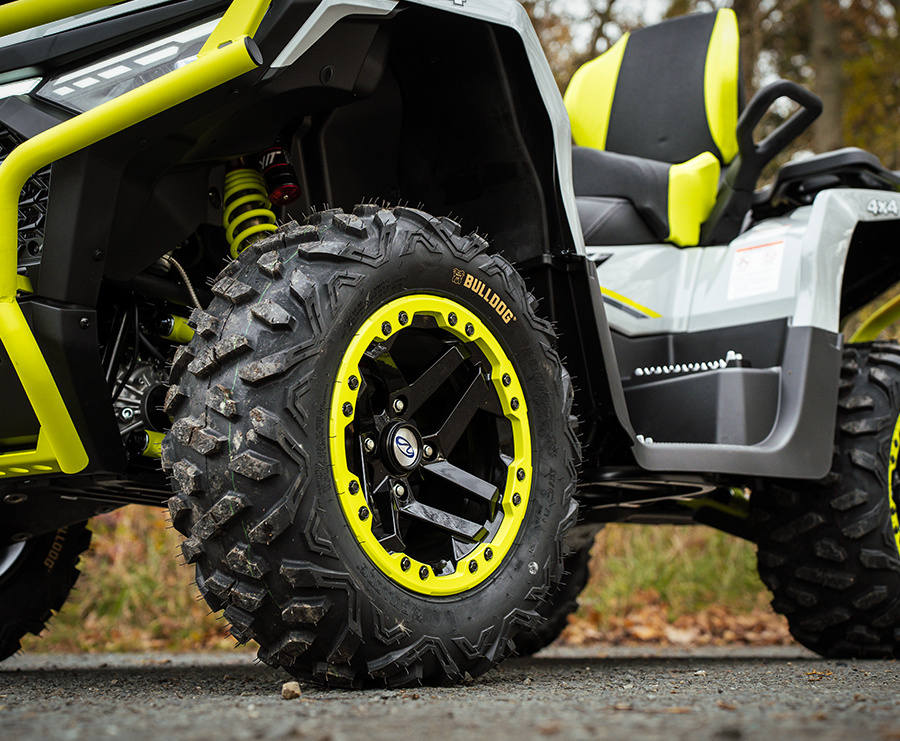 - S komfortne vyladeným podvozkom, nezávislým zavesením kolies, vysokými zdvihmi perovania a plne nastaviteľnými plynokapalinovými tlmičmi s oddelenou nádobkou pokoríte aj najťažší terén. Veľké kolesá s 26-palcovými pneumatikami poskytujú lepšiu priechodnosť a súčasne dávajú štvorkolke väčšiu svetlú výšku. Pneumatiky Bulldog s hlbokou agresívnou vzorkou vás nenechajú na holičkách ani v náročnom teréne alebo hlbokom bahne. Kolesá Beadlock držia pneumatiky spoľahlivo na mieste a umožnia vám jazdiť bez obáv, že sa v drsnom teréne vyzlečie pneumatika z ráfika.