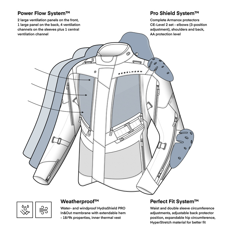 Bunda Rebelhorn Hardy 3.0 poskytuje plnú bezpečnosť vďaka chráničom Armanox na lakťoch, ramenách a chrbte a spĺňa normy CE LEVEL AA. Chrániče lakťov majú trojstupňové nastavenie polohy, čo umožňuje dokonalé prispôsobenie.